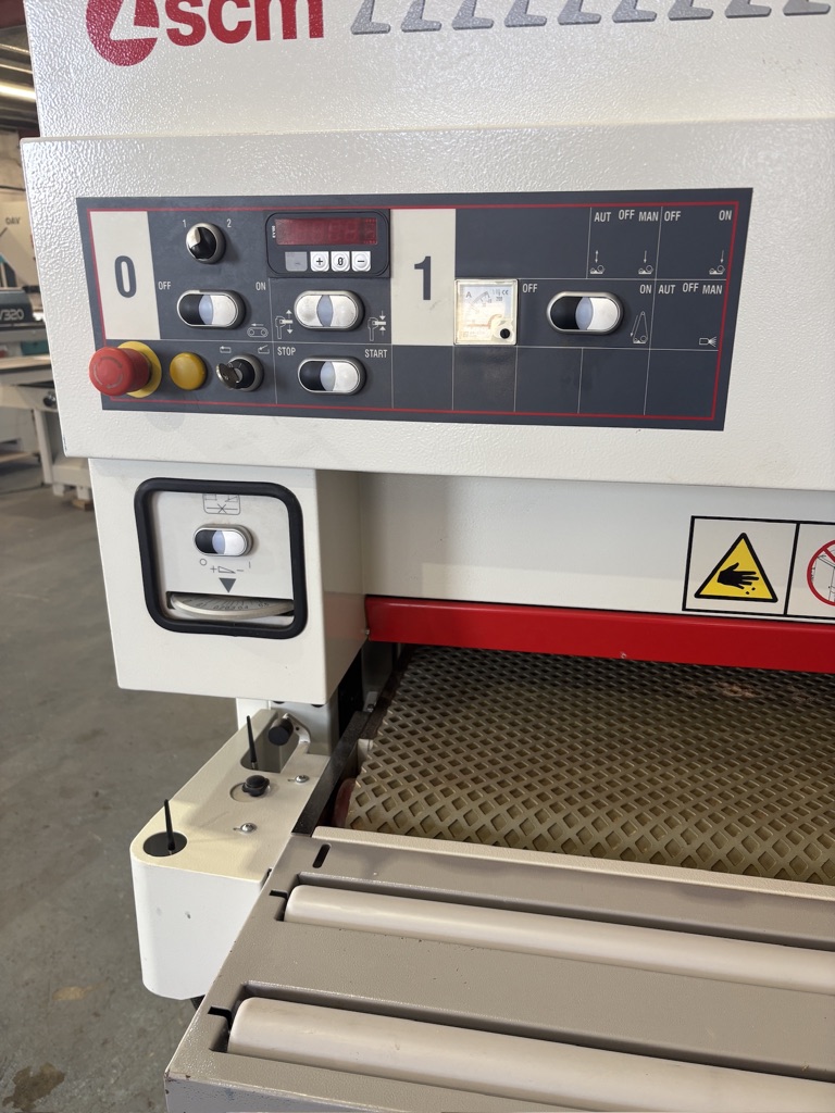 SCM DMC Sd10, through feed sander with combination head with helicoidal steel grooved roller and stiff pad. Electronic tracking, power rise and fall with LED display for the thicklness. For solid wood and calibrating requirements.